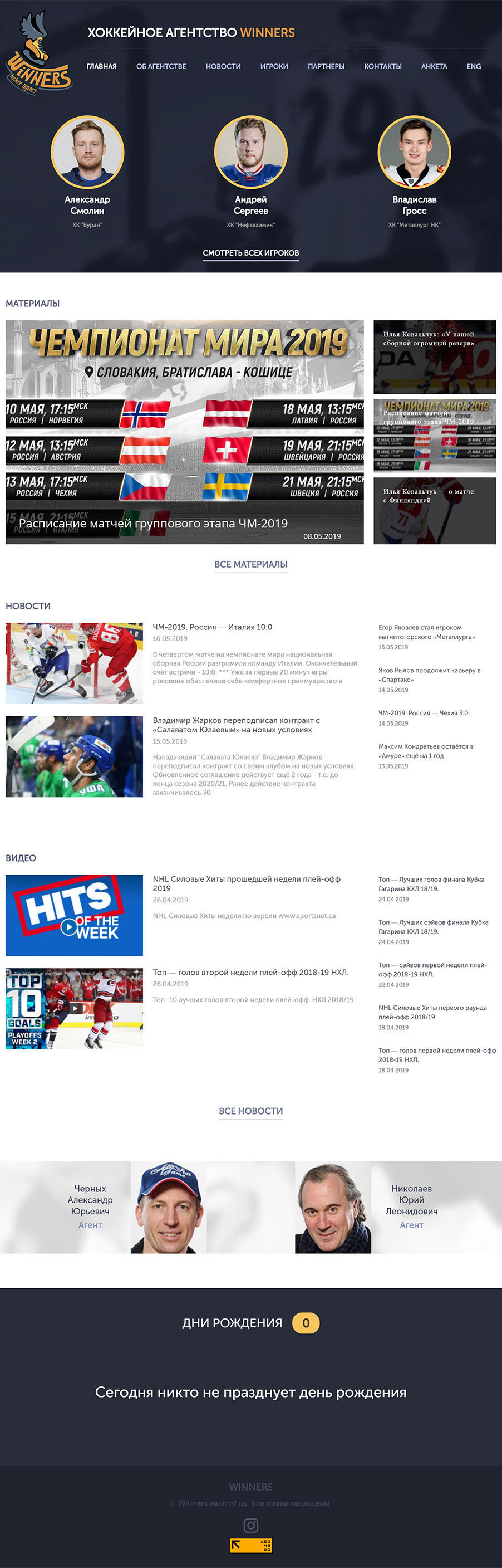 Как итог - агентство получило стильный информативный сайт с исчерпывающей информацией о текущих клиентах, а также формой для привлечения новых хоккеистов.