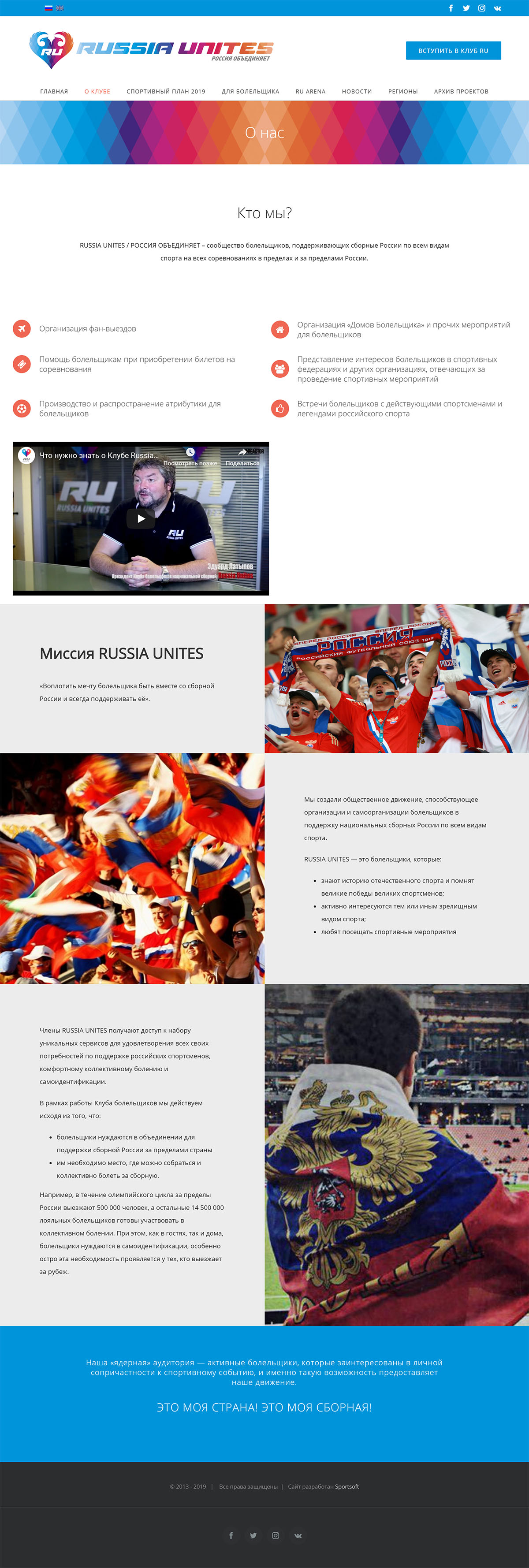 Russia Unites - это не просто группа людей, живущих спортом и болеющих за страну на международных мероприятиях, а философия, стиль жизни. У организации есть своя миссия, которая описана на сайте в разделе “О клубе”.